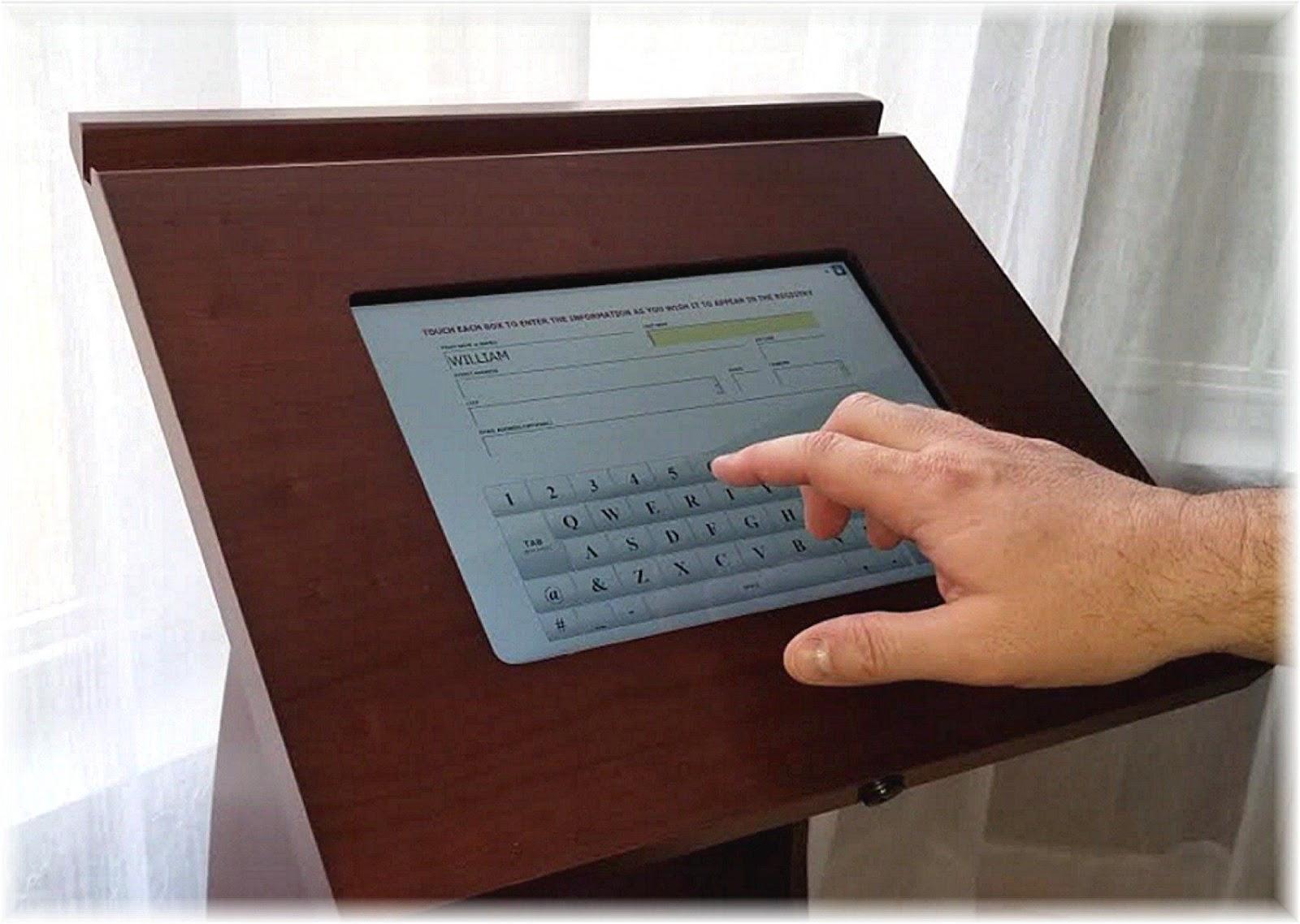 The easiest of the digital registry products on the market, DRS Digital Registry Systems has many styles of beautiful handcrafted enclosers that house our equipment. By signing in through our touch screen interface, ALL information will be easily deciphered. The data entry screen has an enlarged keyboard with only the keys needed to register for ANY type of event. After entering your name, address and zip code, the zip code recognition feature automatically fills the city-state-country fields for you. Only 4 fields need to be filled in and you are registered!